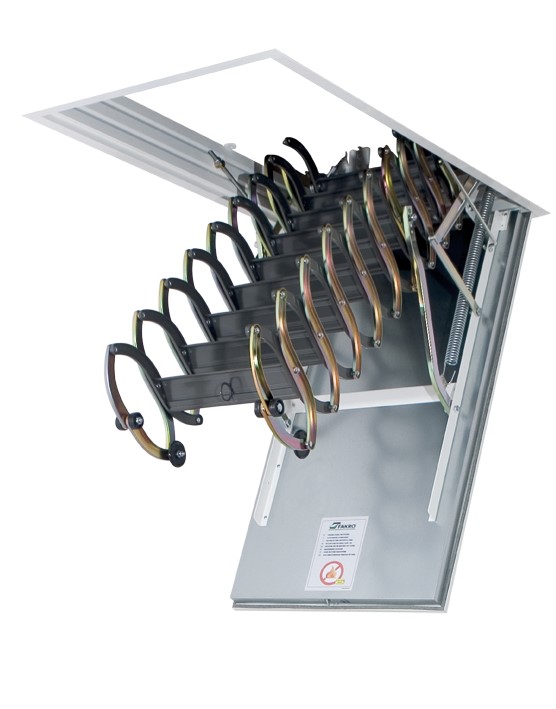 Чердачные раздвижные лестницы Факро LSF купить. Fakro лестница огнестойкая EI-60. Чердачные лестницы Fakro металлические, сжимаются как гармошка, конструкция с противопожарной прокладкой и огнестойким люком лестницы, может использоваться как преграда распространению огня. Анодированные боковые элементы, белый короб и ступени металлические порошково-окрашенные.