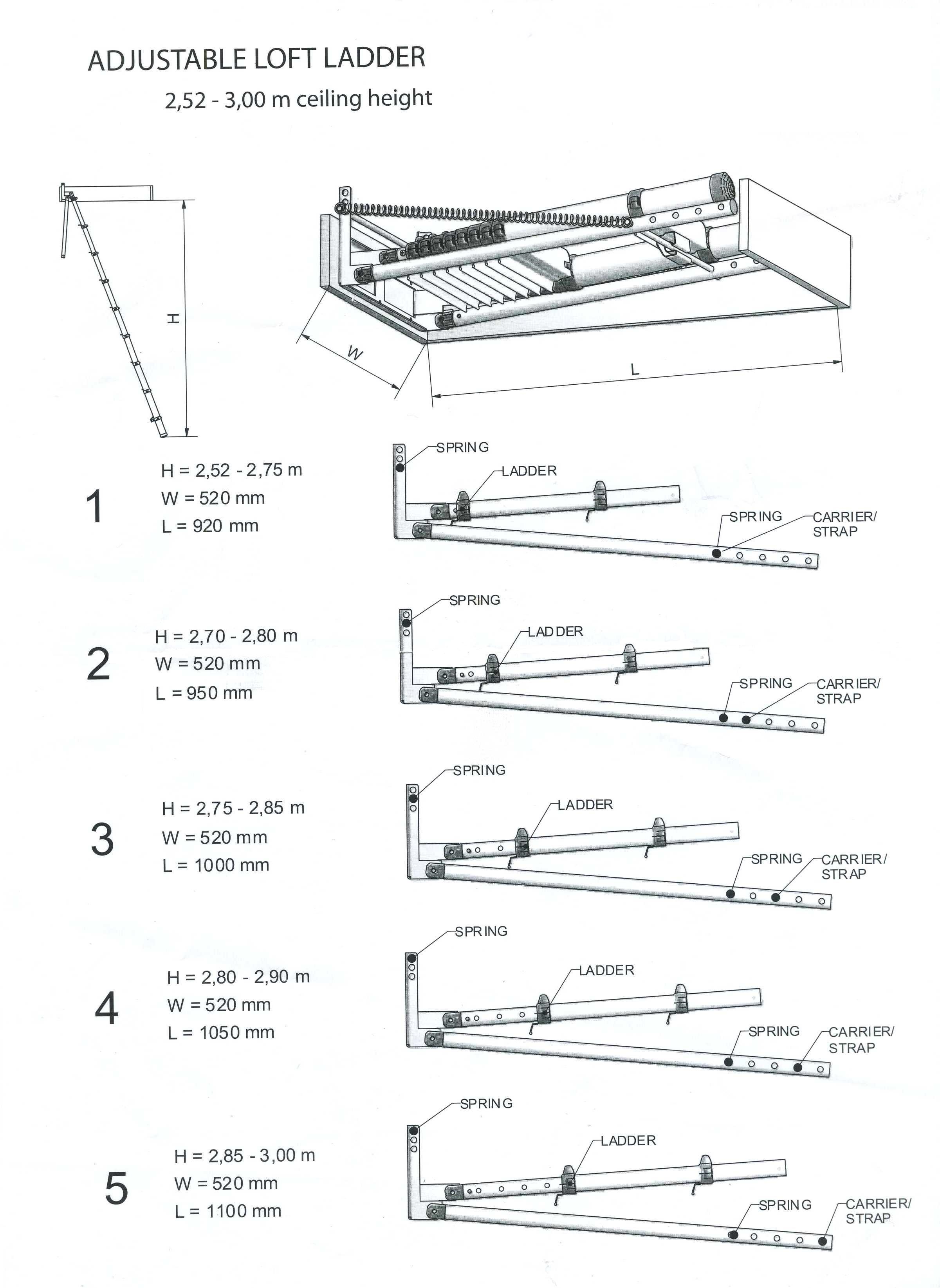 Для лестницы дополнительного места не нужно, она занимает только размер проема 52х60 или 52х92 -110 см. Чердачные лестницы легко настроить под высоту потолка в диапазоне от 205 см до 302 см. Массивные алюминиевые защелки на тетиве надежно фиксируют лестницу как в сложенном, так и в рабочем состоянии. Рекомендуемое пространство для раскладывания лестницы: от 112 см до 120 см от края проема, к которому закреплена лестница.