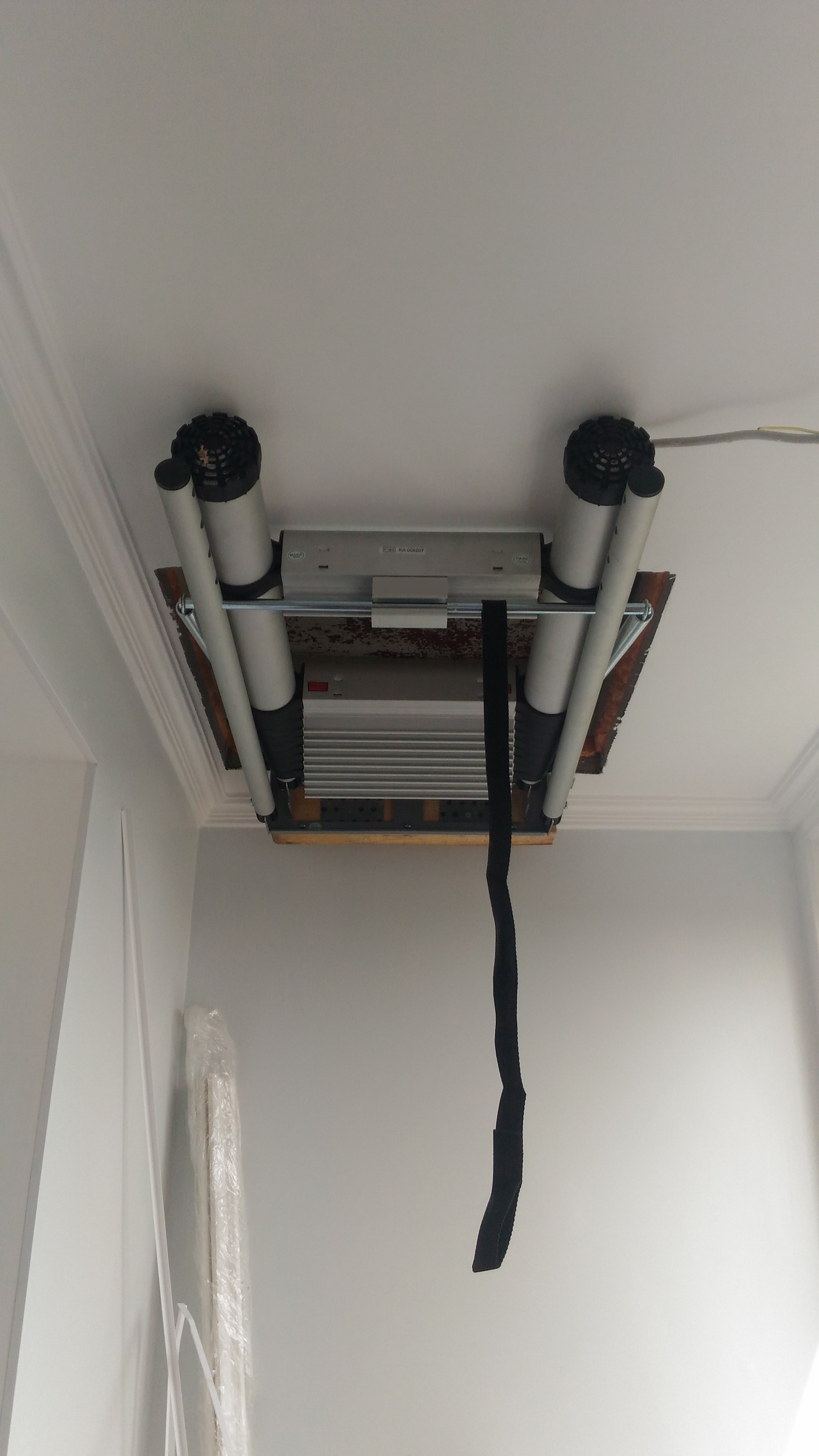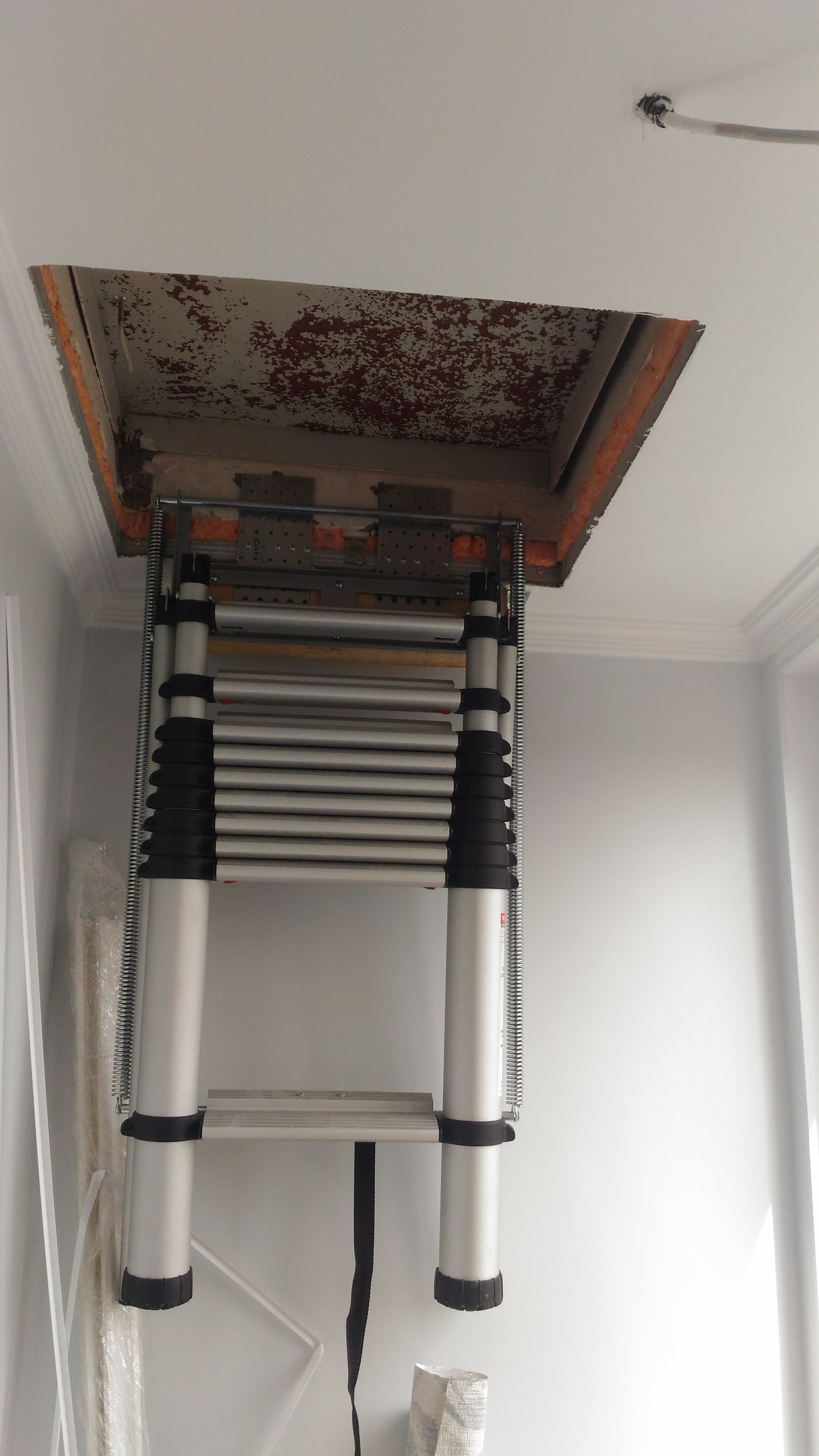 Телескопическая алюминиевая чердачная лестница с пластиковыми торцевыми заглушками и литыми алюминиевыми защелками для предотвращения случайного складывания или раскладывания, поручень, комплект фурнитуры и алюминиевая штанга для раскладывания лестницы.