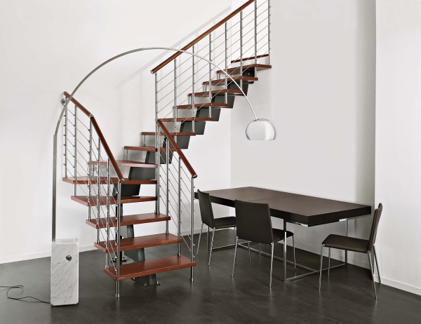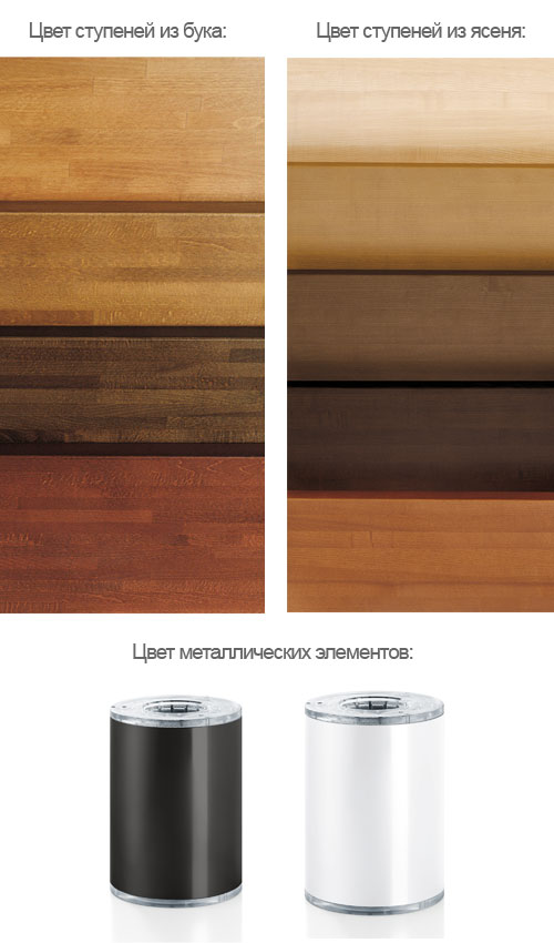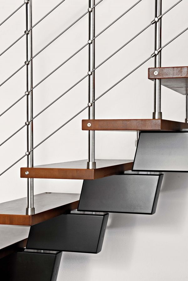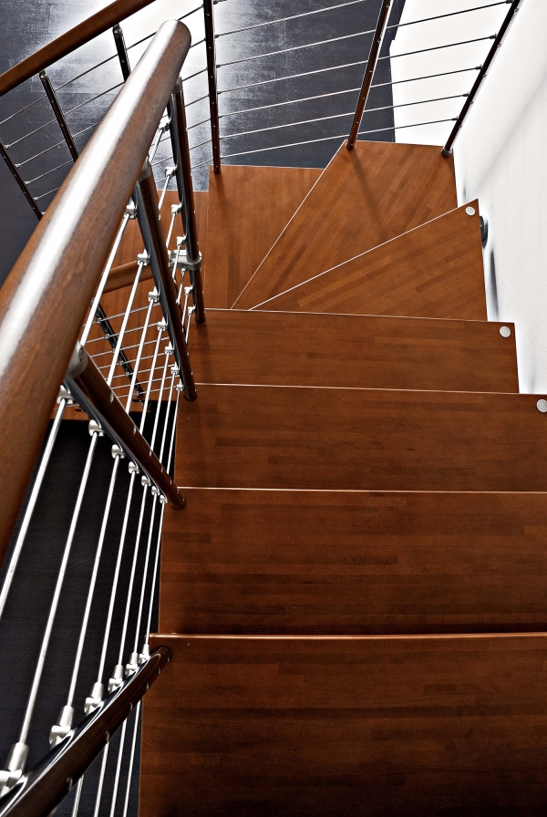 В квадратных винтовых лестницах и пристенных маршевых лестницах вместо перил можно использовать поручень, прикрепленный к стене. В конструкцию лестницы входят стальные опоры и разделители из прозрачного поликарбоната, позволяющие регулировать высоту. Ступени могут быть изготовлены из натурального бука или ясеня, толщиной 42 мм.