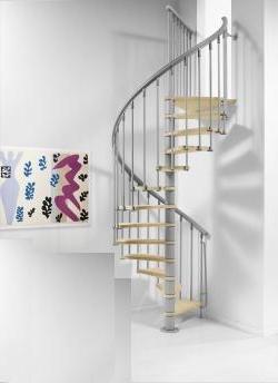 Винтовые лестницы для дачи NICE-1, деревянные межэтажные, интерьерные, (производство Италия). Поверхность ступеней лестницы не обработаны лаком, что дает возможность это сделать самостоятельно, придав лестнице необходимый цвет и оттенок. Поручень и металлические части лестницы на второй этаж окрашены в серый цвет.