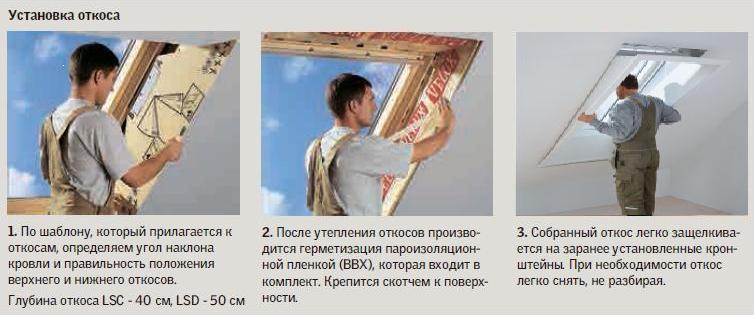Фирменные откосы на мансардные окна VELUX (Велюкс), предназначаются для оформления качественной финишной отделки по периметру мансардных окон VELUX. Фирменный откос на мансардные окна Велюкс подбирается из расчета толщины кровельного "пирога". Максимальная толщина стандартных откосов Велюкс 40см. На заказ возможно 50см. Откосы Велюкс из ПВХ только белого цвета. В комплектацию входят 4 плоскости откосов из ПВХ белого цвета, наличники, стусло, скотч, шаблон, саморезы, подробная инструкция по монтажу и обязательно на мансардные окна Velux входит и паро - изоляционный комплект BBX для защиты утеплителя от паров.