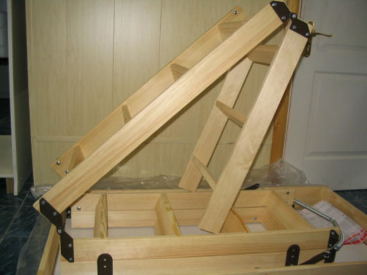 Крышка лестницы представляет собой многослойную конструкцию - деревянная рама, внутри которой находится теплоизоляция, обшита оцинкованной сталью. Люк лестницы покрыт белой эмалью и защитной пленкой. Лестницы раздвижные органично вписывается в потолок, обшитый гипсокартоном. Металлический стержень для открывания лестницы в комплекте.