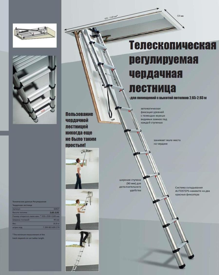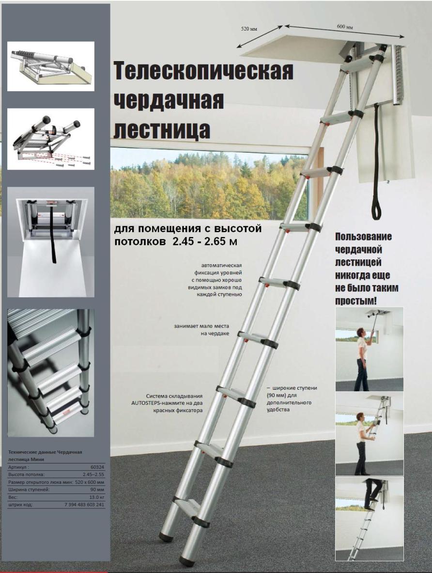 Чердачные лестницы телескопические алюминиевые купить, без короба и крышки, ALU-Телестеп