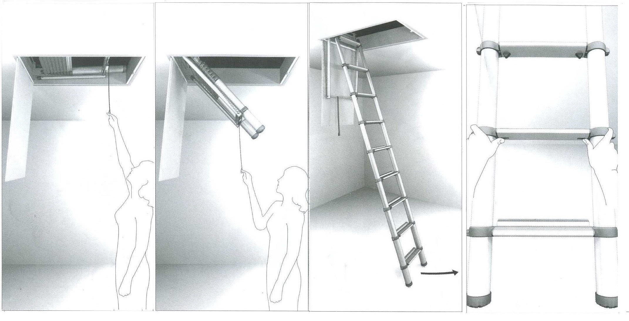Телескопическая алюминиевая чердачная лестница с пластиковыми торцевыми заглушками и литыми алюминиевыми защелками для предотвращения случайного складывания или раскладывания, поручень, комплект фурнитуры и алюминиевая штанга для раскладывания лестницы.
