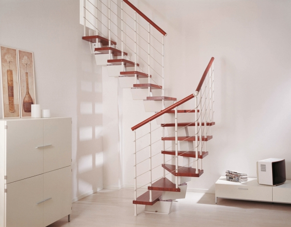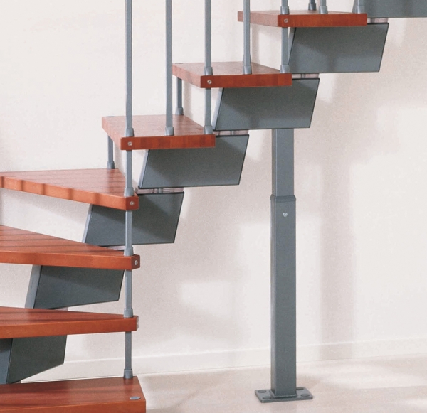 В квадратных винтовых лестницах и пристенных маршевых лестницах вместо перил можно использовать поручень, прикрепленный к стене. В конструкцию лестницы входят стальные опоры и разделители из прозрачного поликарбоната, позволяющие регулировать высоту. Ступени лестницы изготовлены из натурального бука толщиной 42мм. Крепежные и соединительные элементы изготовлены из металла с окраской в цвет лестницы. Завершающие элементы поручней и элементы тросов перил покрыты нержавеющей сталью.