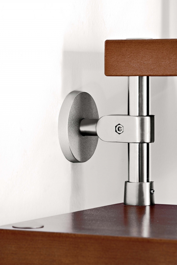В квадратных винтовых лестницах и пристенных маршевых лестницах вместо перил можно использовать поручень, прикрепленный к стене. В конструкцию лестницы входят стальные опоры и разделители из прозрачного поликарбоната, позволяющие регулировать высоту. Ступени могут быть изготовлены из натурального бука или ясеня, толщиной 42 мм.