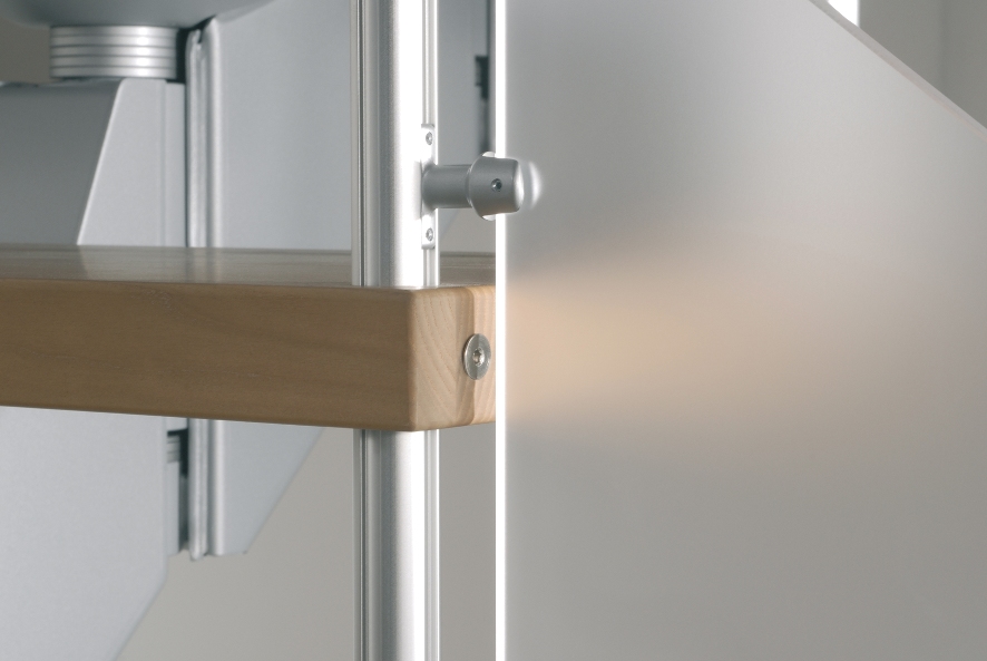 Маршевые итальянские лестницы Scenik VERVE RA купить. Ступени и поручень выполнены из цельного массива ясеня светлого (натурального) или темного цвета. Ограждение состоит из столбиков из нержавеющей стали и сплава ударопрочного акрилового стекла с дизайнерским тиснением поверхности, расположенных параллельно поручню. Под заказ высота до 390 см.