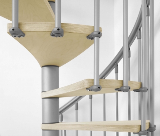 Винтовые лестницы для дачи NICE-1, деревянные межэтажные, интерьерные, (производство Италия). Поверхность ступеней лестницы не обработаны лаком, что дает возможность это сделать самостоятельно, придав лестнице необходимый цвет и оттенок. Поручень и металлические части лестницы на второй этаж окрашены в серый цвет.
