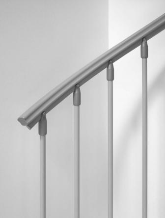 Поручень лестницы на второй этаж выполнен из поливинилхлорида и окрашен в серый цвет, как и металлические части лестницы.