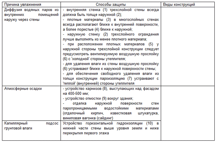 Из-за неоднородной структуры трехслойной стены и применения материалов с различными теплозащитными и пароизоляционными характеристиками в толще конструкции может образовываться конденсационная влага, наличие которой снижает теплоизоляционные свойства ограждения. Поэтому при возведении трехслойных стен следует предусмотреть их защиту от увлажнения.