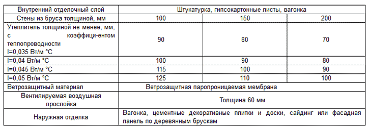Для защиты утеплителя от увлажнения дождевой водой вентилируемый фасад устраивают на высоте 300-500 мм от поверхности отмостки. Деревянные брусчатые стены можно утеплить с наружной стороны путем устройства защитной облицовки по деревянным брускам (См. таблицу №9)
