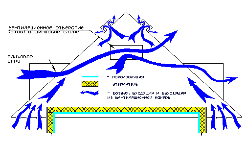 Рис.1 Схема утепления, пароизоляции и вентиляции нежилого чердачного помещения.